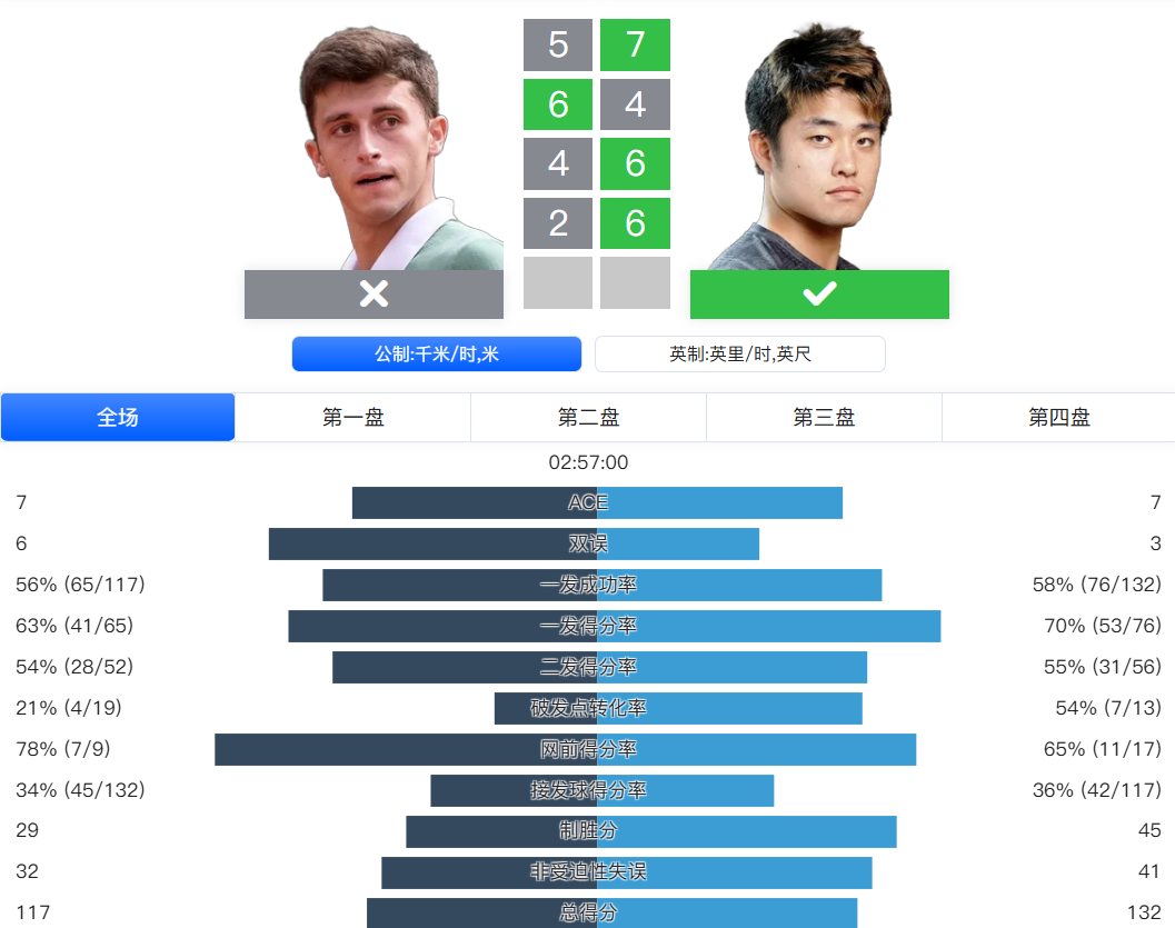 数据双方不相上下 对手决胜盘表现更好
