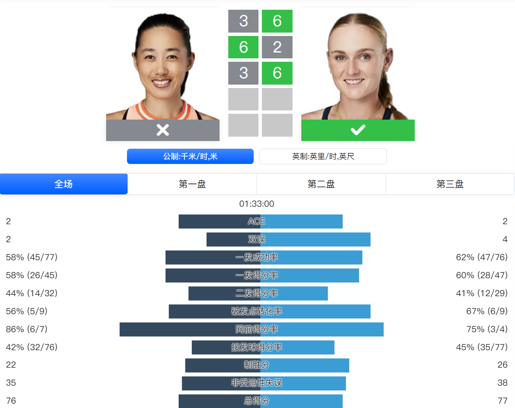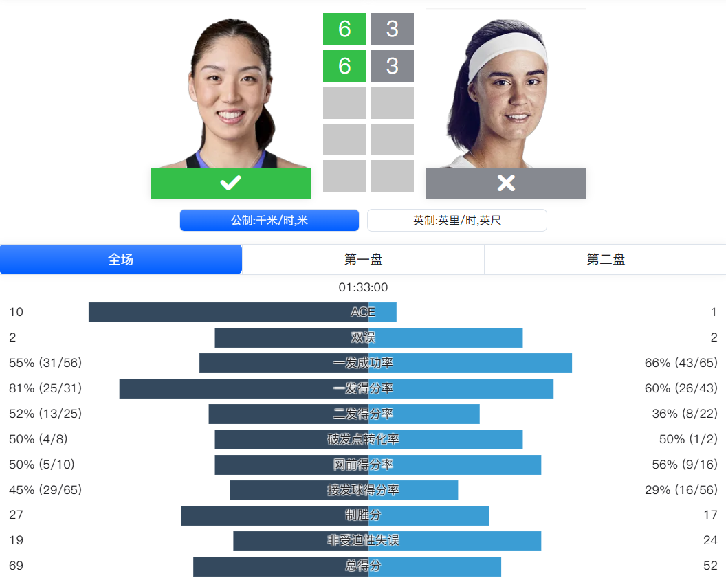 面对从资格赛打上来的卡利尼娜,王欣瑜此役交出了完美数据:超过8成的一发得分率,4次破发,27个制胜分。比赛过程一路顺风,仅耗时1小时33分钟便拿下胜利。下一轮她将和前法网女单冠军奥斯塔彭科隔网相对。